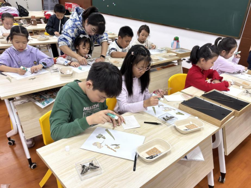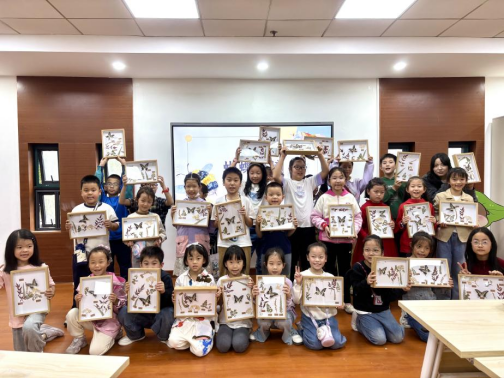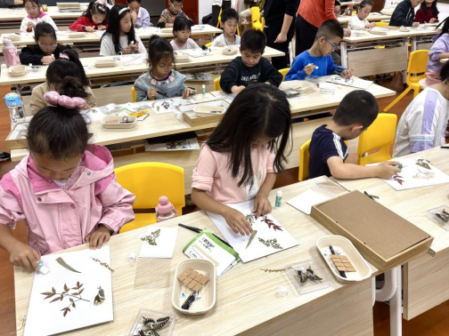 接下来是本次活动的重头戏——“蝴蝶秘境”,每位小朋友领取了一份材料包,里面有精心处理的蝴蝶标本、各种压花植物以及画框底板等。老师一边示范一边讲解,小朋友们则化身“小小艺术家”,开始发挥自己的想象力,小心翼翼地将蝴蝶安置在自己设计的“秘境”中,生怕弄坏了这美丽的“精灵”。他们有的营造出蝴蝶在花丛中翩翩起舞的场景,有的则重现了森林树冠层的生态环境。当一幅幅独一无二的蝴蝶植物标本画完成时,孩子们脸上都露出了自豪的笑容。