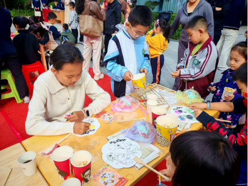 团扇,象征着团圆友善、吉祥如意。“亲子手作团扇” 区同样热闹非凡。孩子们在这里化身“小小艺术家”,素白的团扇、五彩的颜料和各种精美的干花材料在指尖飞舞。有的家庭绘制了可爱的玉兔捣药图,有的则描绘了明月与星空,还有的将秋日的花卉巧妙粘贴,创作出一幅幅立体画作。一把把小小的团扇,不仅摇出了秋日的凉风,更摇出了亲子间共同创造美的温馨时光。