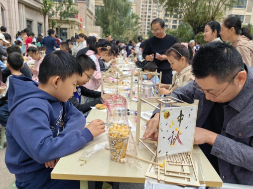 在 “古风宣纸灯笼制作” 区,志愿者提前准备了空白宣纸灯笼、颜料、画笔与流苏等材料。家长与孩子围坐在一起,在专业老师的指导下,通力合作,共同构思设计,搭建骨架、粘贴宣纸、绘制图案、点缀流苏。一笔一画间,是专注与创意的交融;一粘一贴中,是亲情与默契的传递。当亲手制作的灯笼被点亮,暖黄的灯光透过宣纸洒出柔和的光晕,孩子们举着灯笼四处展示,脸上洋溢着满满的成就感,仿佛将中秋的明月捧在了手中。