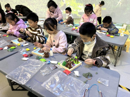 活动最让人期待的当然是动手环节——“制作河狸之家”,在了解了河狸这位动物界著名的“水利工程师”如何用树枝和泥巴修筑水坝、搭建巢穴后,孩子们早已摩拳擦掌,迫不及待地想要一展身手。工作人员为每位孩子分发了材料包:小木棍、苔藓、粘土……在老师的指导下,孩子们化身“小小建筑师”,发挥自己的想象力和创造力,开始为河狸搭建家园。有的小朋友仔细挑选粗壮的树枝搭建房屋框架,有的用黏土固定细节。经过一番努力,一个个形态各异、充满童趣的“河狸之家”就诞生了,孩子们捧着自己亲手制作的小屋,成就感满满。